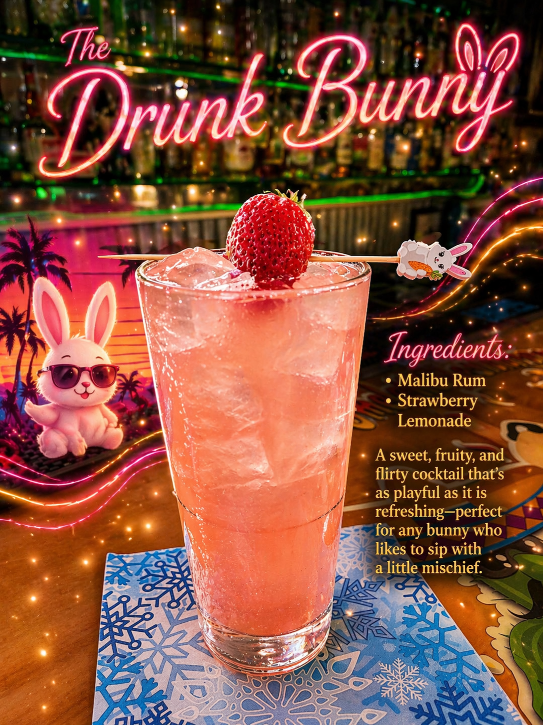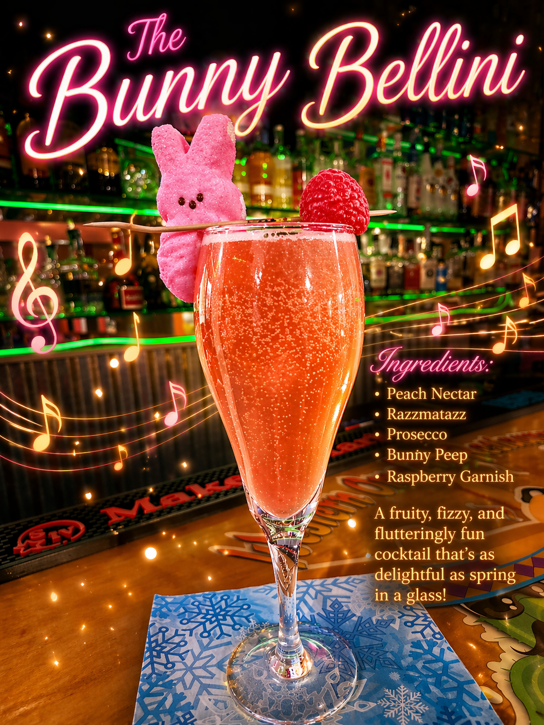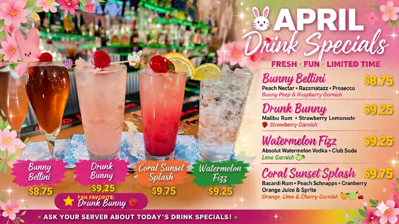 Fresh • Fun • Limited Time. Bunny Bellini, Drunk Bunny, Watermelon Fizz and Coral Sunset Splash — our hoppin' April lineup!
